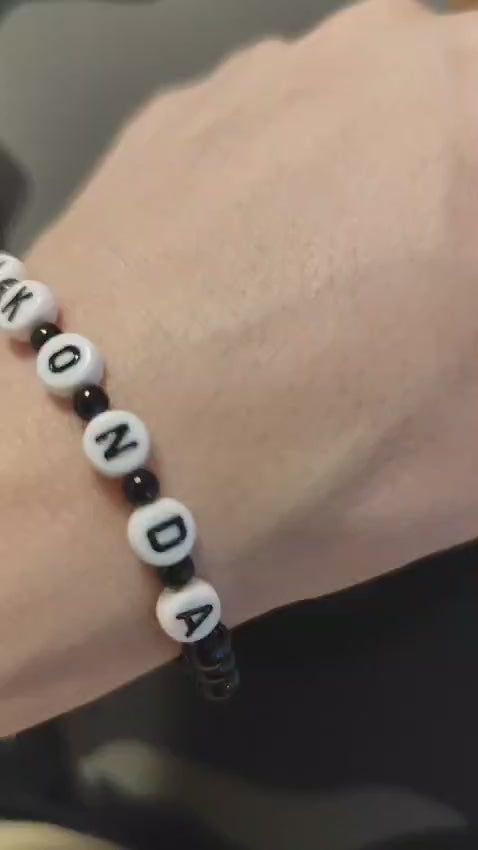 The Babakonda Beaded Bracelet is crafted with black decorative beads in 4 mm and 6 mm, combined with black and white letter beads spelling “Babakonda.” The mix of bead sizes adds subtle depth while keeping the look clean and balanced.